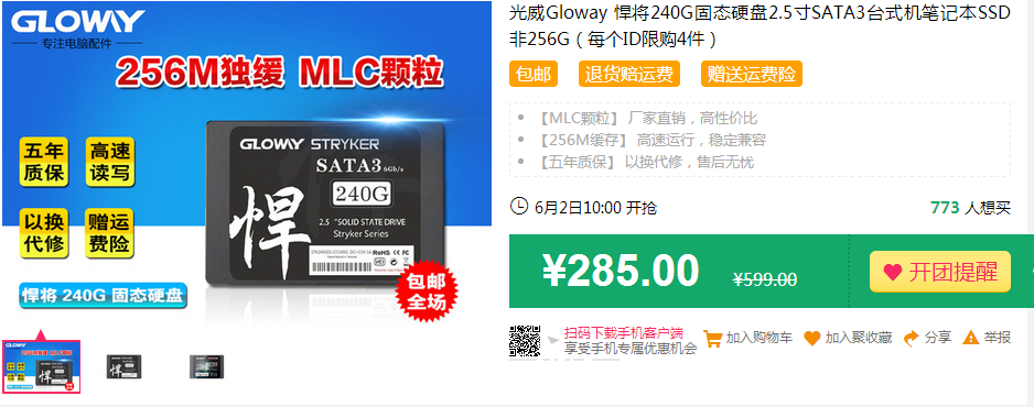 光威Gloway悍将240G固态硬盘,2.5寸SATA3 SSD,采用MLC颗粒,256M独立缓存,这款固态硬盘将在聚划算开团,团购价285元,每个ID限购4件,6月2日10点开抢,6月4日9点截止,有需要的朋友可以提前设置开团提醒哦!