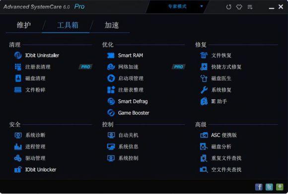 Advanced SystemCare作为一款在国外非常流行的系统优化工具,提供了非常丰富的功能菜单,主要分为诊断,维护,优化三大类别。