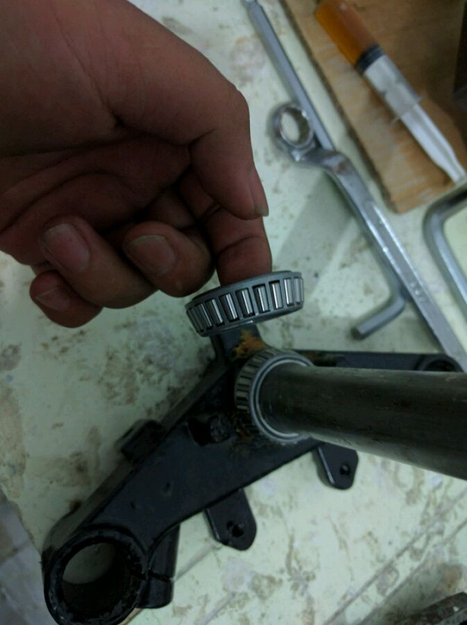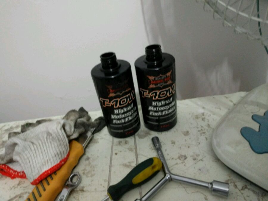 4月20号中午正常行驶躲人家轿车下雨天路滑摔车了。左手腕骨折。在家休息一个多月了。想起来把车修一修。。问题不是太大。就是前三星弯了然后找修车铺换了一根但是由于技术太差减震给修车的整成棍子了一点压缩都没有了。。换了减震油,换了方向柱轴承,还有大灯壳摔烂了要换一换。还保养了后刹车。。自己一个人在地下车库修车。