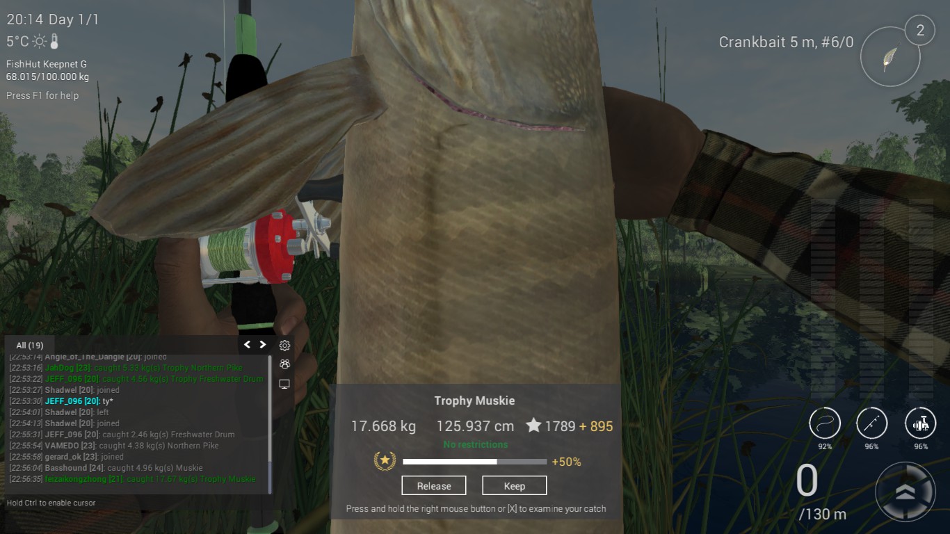 最近找到了一套不错的钓muskie的方法,人品一般的话,如果有premium的话,现实一个小时可以弄到12k经验。