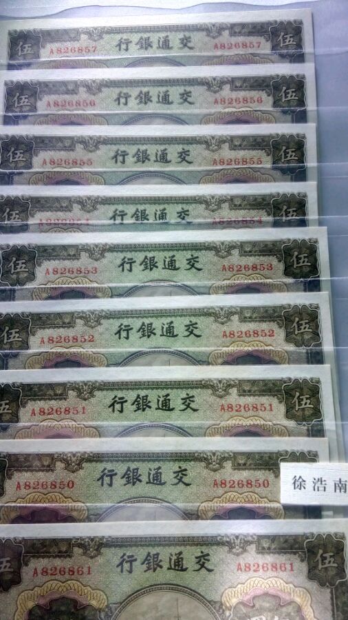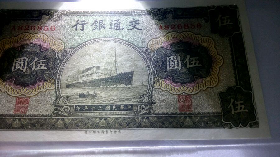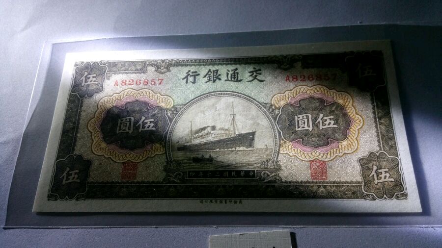 民国三十年,交通银行,商务书馆印刷,五元军舰,绝品无瑕疵,票面干净无折痕,角尖不黑无潮斑,荧光灯检查无斑包原票!280一张包申通!