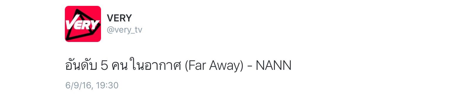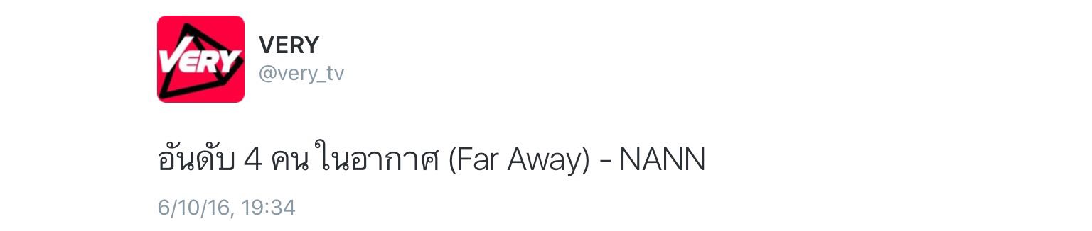 Nann的新单曲《Far Away》在5月23日已经发布,如果你喜欢她的新歌并可以上推特,请帮助她来推歌。暂时只看到了very tv的推歌活动,如果之后看到其他的,再补充。如果你是老粉,参与过去年的推歌,忽略我接下来说的,直接看下一段吧。新歌上了verytv的榜单后,会有45天的推歌时间,粉丝每日发推特@verytv来帮助nan打歌,也可以使用泰国手机号码发短信来打歌。两种方式按比例加和后的支持者越多在榜单的排名越高。very tv会发推特公布每日的排名。