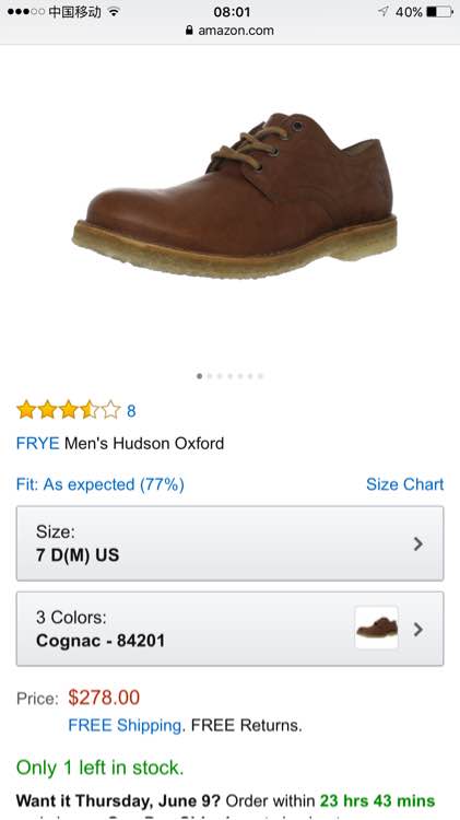 海淘了一双frye牛津 7M 估计尺码悲剧了