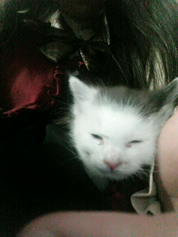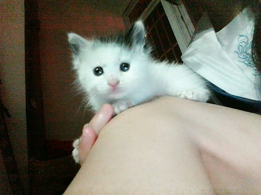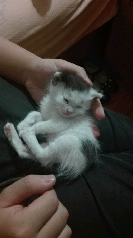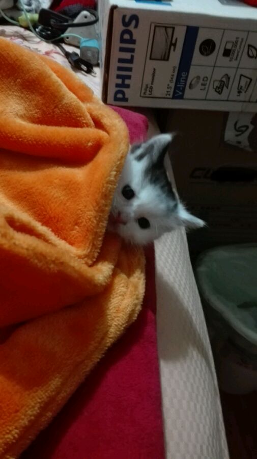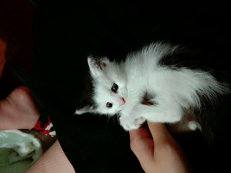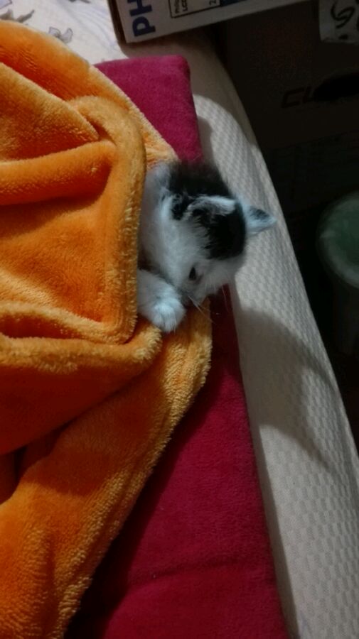 箱子里面有一个喂奶的注射器,和两块馒头,于是我把你抱会了家,当时我很慌张,因为我虽然很想养猫但是没养过,因为我想等家里的两只仓鼠去世了再养,于是我又是给你拍照又是发给身边养猫的朋友学习饲养你的方法