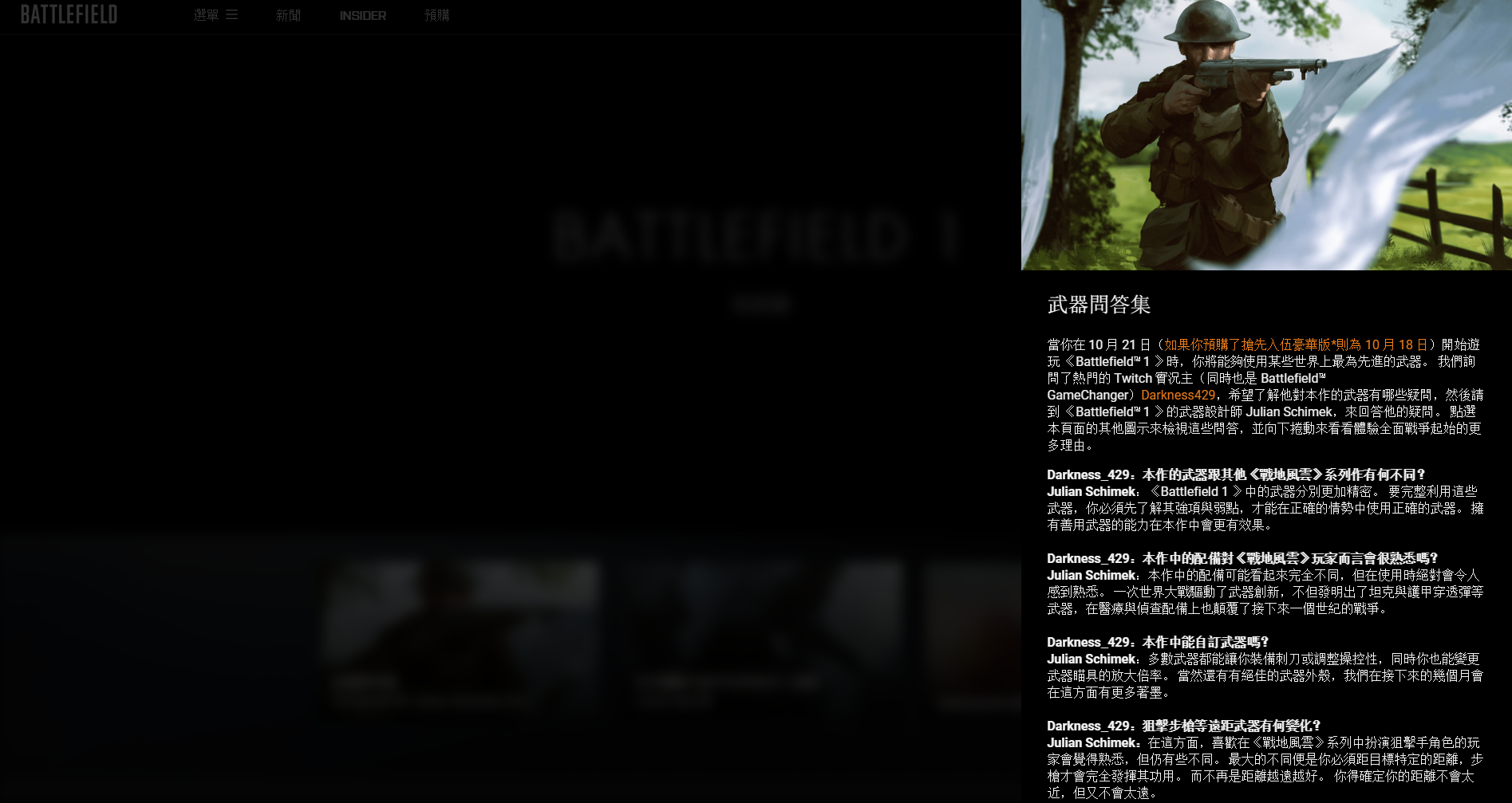 當你在 10 月 21 日(如果你預購了搶先入伍豪華版*則為 10 月 18 日)開始遊玩 《Battlefield™ 1 》時,你將能夠使用某些世界上最為先進的武器。 我們詢問了熱門的 Twitch 實況主(同時也是 Battlefield™ GameChanger)Darkness429,希望了解他對本作的武器有哪些疑問,然後請到 《Battlefield™ 1 》的武器設計師 Julian Schimek,來回答他的疑問。 點選本頁面的其他圖示來檢視這些問答,並向下捲動來看看體驗全面戰爭起始的更多理由。