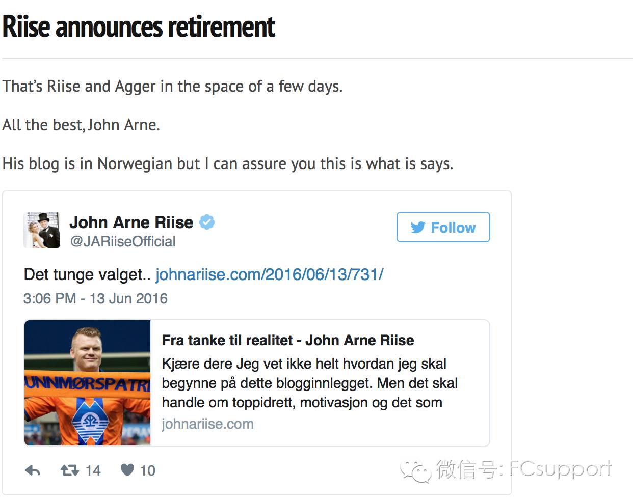 里瑟在twitter上宣布退役