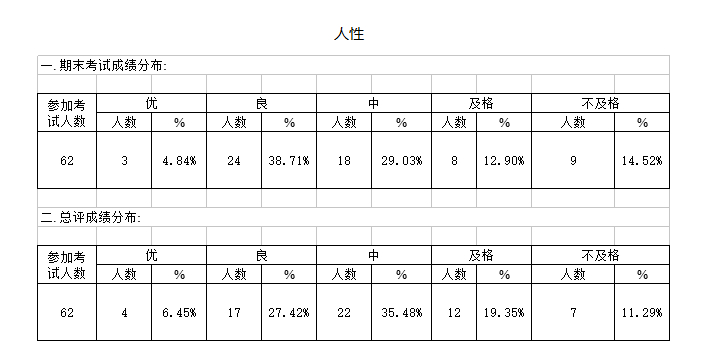 以下这些表格是各门课程卷面成绩和总评成绩的总体数据分析,相信各位同学能看出,虽然是通识选修课,但我开的课考试还是有一定难度的,除《人性》《哲学导论》两门1学分课程以论文形式考核外,其他2学分选修课都是卷面考试,且卷面成绩几乎每门都有人无法考到及格,最难的是《中国思想史》,卷面有24%以上的同学没有及格,我想很多专业课也达不到这样的难度。之所以设置这样的难度,是为了给大家一个严格的要求,通过考试来检验一学期在课上学到的东西。也是为了拉开差距,让坚持认真学习的同学能够通过考试展示自己的才华。