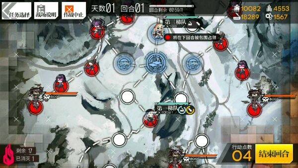 一队放指挥部,二队狗粮手枪放指挥部上方。开局一队往下走打一战(图一站的位置)然后继续往左下走占领机场,二队往下走一格到指挥部。第二回合一队往右走打一战后返回机场撤退。这两个点强度不高,经验可观 3 4星掉率也不错