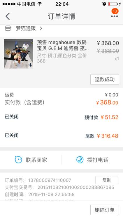 梦猫家的,已经可以补款,预定后店家没确定,定金为0,单子5圆需补368+邮费,联系方式见ID
