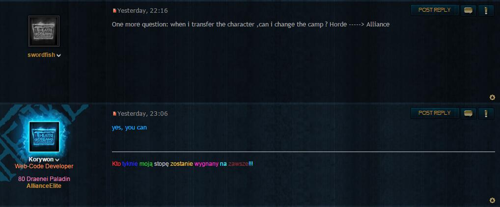 THE SPECIAL PORTAL where you can easily transfer your character will be available soon. The process of transferring is obviously automatic and anonymous, so no one won't know about your decision. We don't require the access password to account on your current server. We don't remove your character from the previous server as well, you will just receive additional character on Theatre of Dreams.