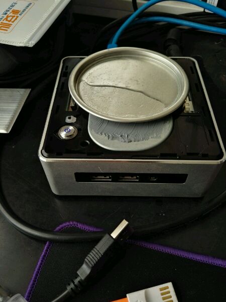 今天,我把我nuc上盖翘掉了,放了个罐头瓶子盖,用散热膏粘上的,瓶盖里放水,放酒精。烤机比之前能低5℃吧。之前82,现在77。风扇转速小了300转吧。