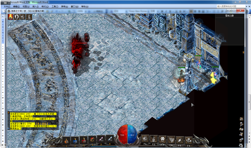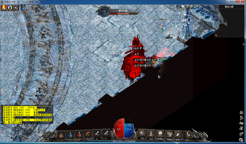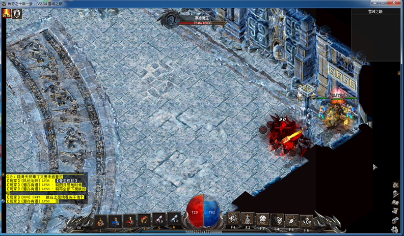 进雪域之巅首先打上古蚁后弄寒冰卷轴,然后带好药(16捆左右大蓝),符(4捆),强效太阳(4到5捆),2小时双倍。进去之后首先引怪,保证一片无怪的区域,如图所示。