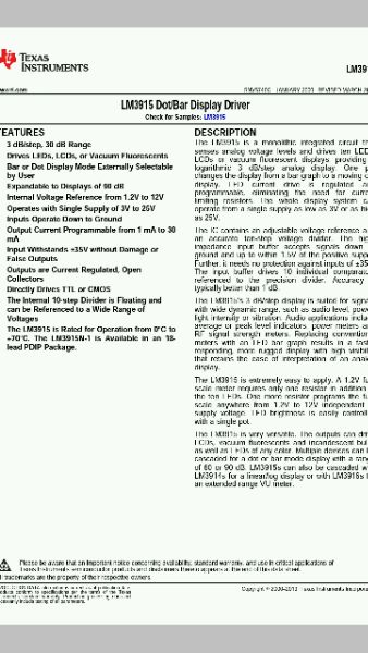 LM3915是单片集成电路,感官模拟电压水平和十led驱动器,液晶显示器或真空荧光显示器,提供一个对数3 dB /步骤模拟显示。销变化从一个条形图显示一个移动的点显示。导致当前驱动器是监管和可编程序,消除需要限流电阻。整个显示系统可以从一个供应低至3 v或高达25 v。集成电路包含一个可调基准电压和一个精确的十步分压器。highimpedance输入缓冲区接收信号降至地面,在1.5 v的积极的供给。此外,它不需要保护输入±35 v。输入缓冲区驱动精密分压器的10个人比较器参考。精度通常比1 dB。LM3915的3 dB /步骤显示适合信号宽动态范围,比如音频水平,能力,光强度或振动。音频应用包括平均或峰值水平指标,电表和射频信号强度米。用LED取代传统的米柱状图导致更快的响应,更崎岖显示能见度高,保留模拟显示的易于解释。LM3915非常容易申请。1.2 v全尺度的计只需要一个电阻器除了十个发光二极管。一个电阻项目全尺度的从1.2 v至12 v电源电压独立的。LED亮度很容易控制用一个锅,LM3915非常多才多艺。输出可以驱动液晶显示器、真空荧光灯和白炽灯的发光二极管任何颜色。可以级联一个点或多个设备栏模式显示了一系列60或90 dB。与LM3914s LM3915s也可以级联一个线性/日志显示或LM3916s长程音量电平。
