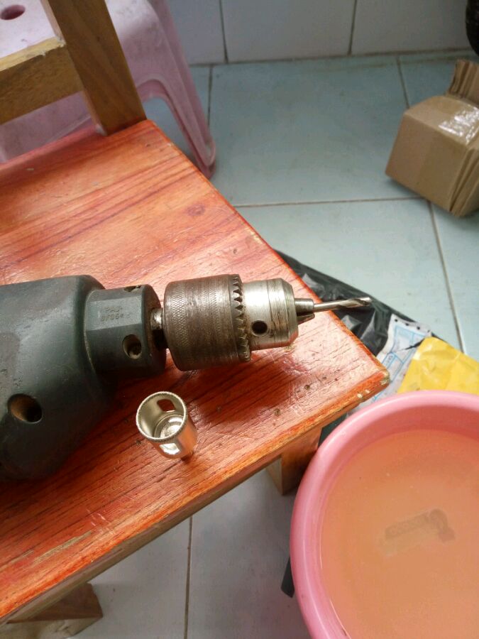 我是先打的孔,然后在在钻头上放上线塞进孔里固定.在夹上转起来慢慢磨!这样不就同心了吗?