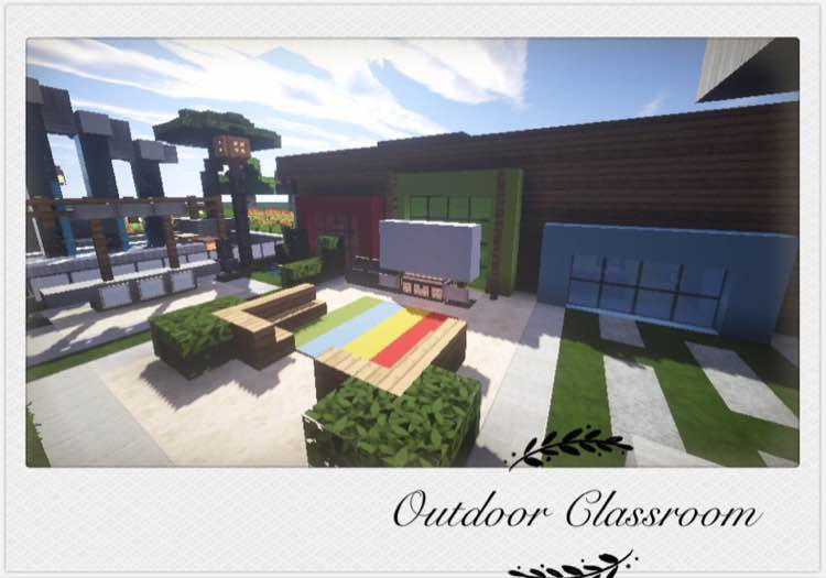 这是后方的运动场 有一键命令方块造的秋千 蹦蹦床 滑梯 中间带有一大水池 旁边是一座小树屋课堂 我想max应该还喜欢这个小课堂的