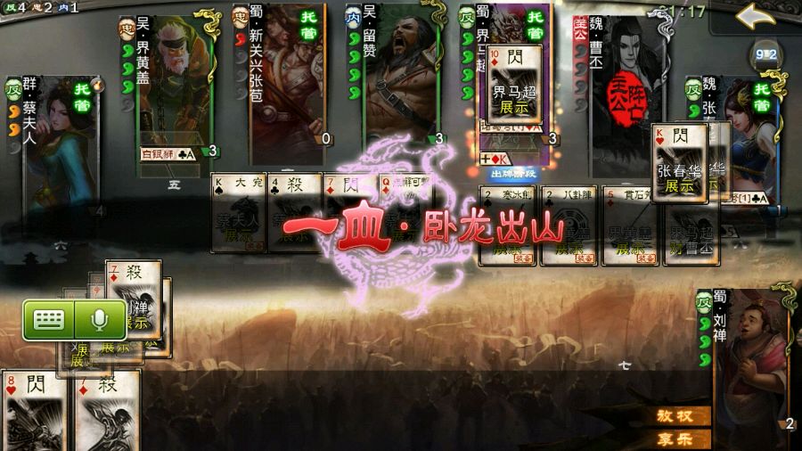 我月英中,另一个中是巨兽,我爆发打死了春哥,留下界云和界夏侯还有一个最近兑换的武将什么鱼贩,曹丕放了南蛮万剑放残了自己两个满血的中,陆逊内本来已经开始杀中了,被逼得又跳回去,因为界云挂着连弩,曹丕三张牌全翻的反贼。