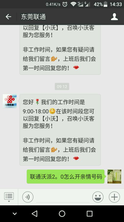 今天回复 小沃 才终于召唤客服成功,还好不需要把旁边符号带上,不然我还真不会。 对此我只想说东莞联通微信客服可以关了,还好10010只要我选0-9,让我输入 小沃 我估计也问不到东西了