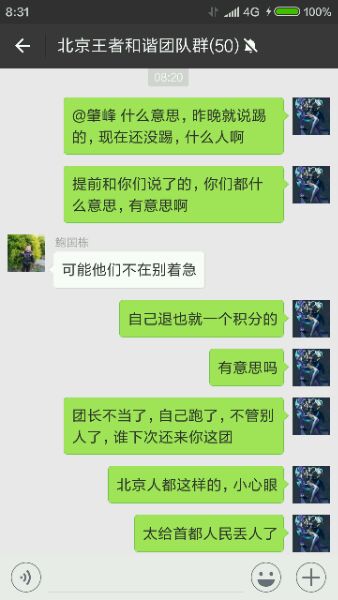 提前都和团长说了下周走的,昨天晚上还叫他踢了,还说别催会踢的,今天早上一看还没踢,他自己倒是不在团里待了,有意思吗,让别的团长踢都不待理人的,都什么人啊,说了几句就把我踢出群了,还北京人呢,什么素质,大家以后别去这个团了