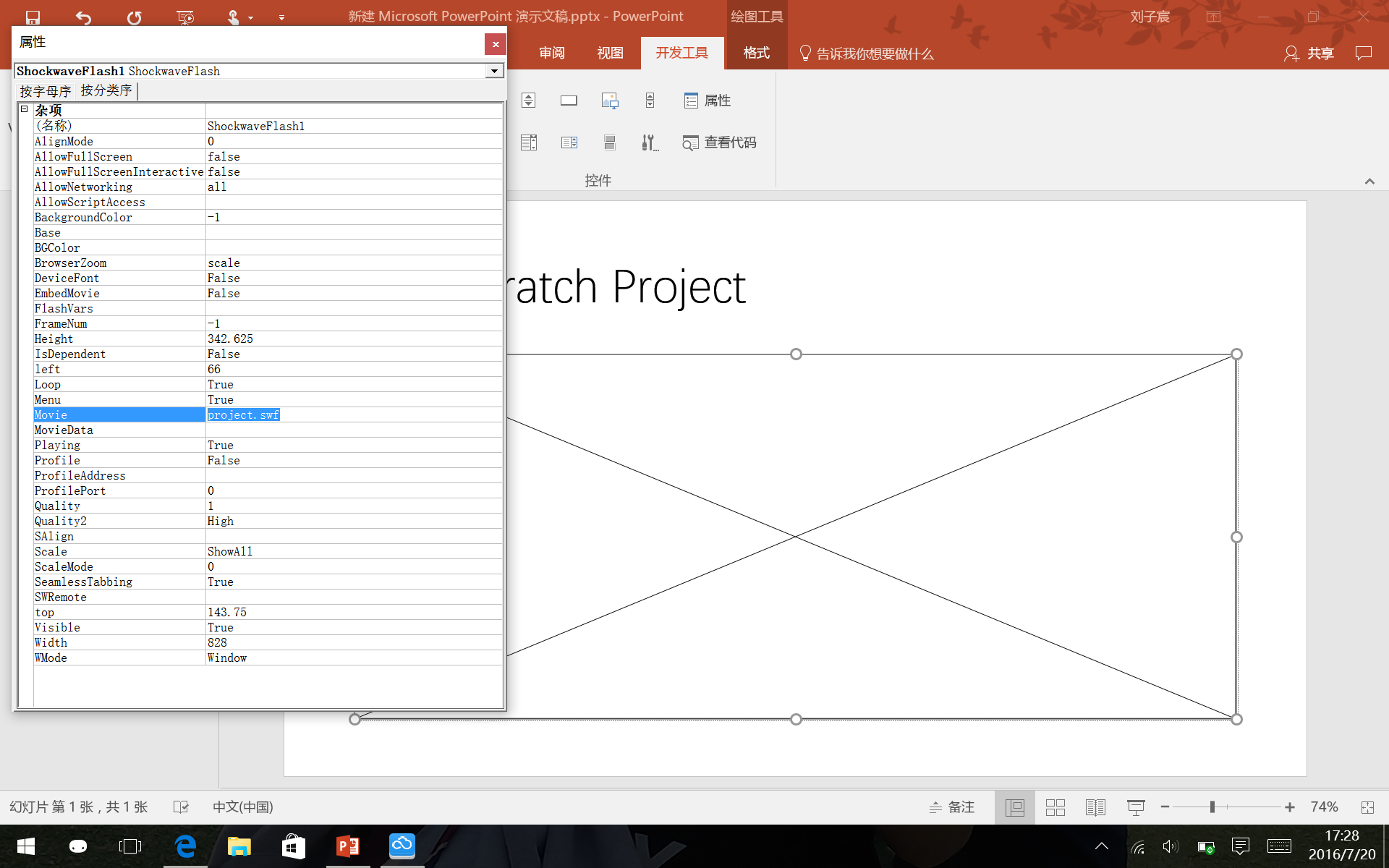 用PowerPoint的小伙伴,请点击 开发工具>其他控件(那个螺丝刀和扳手的图标)然后选择“shockwave flash object”