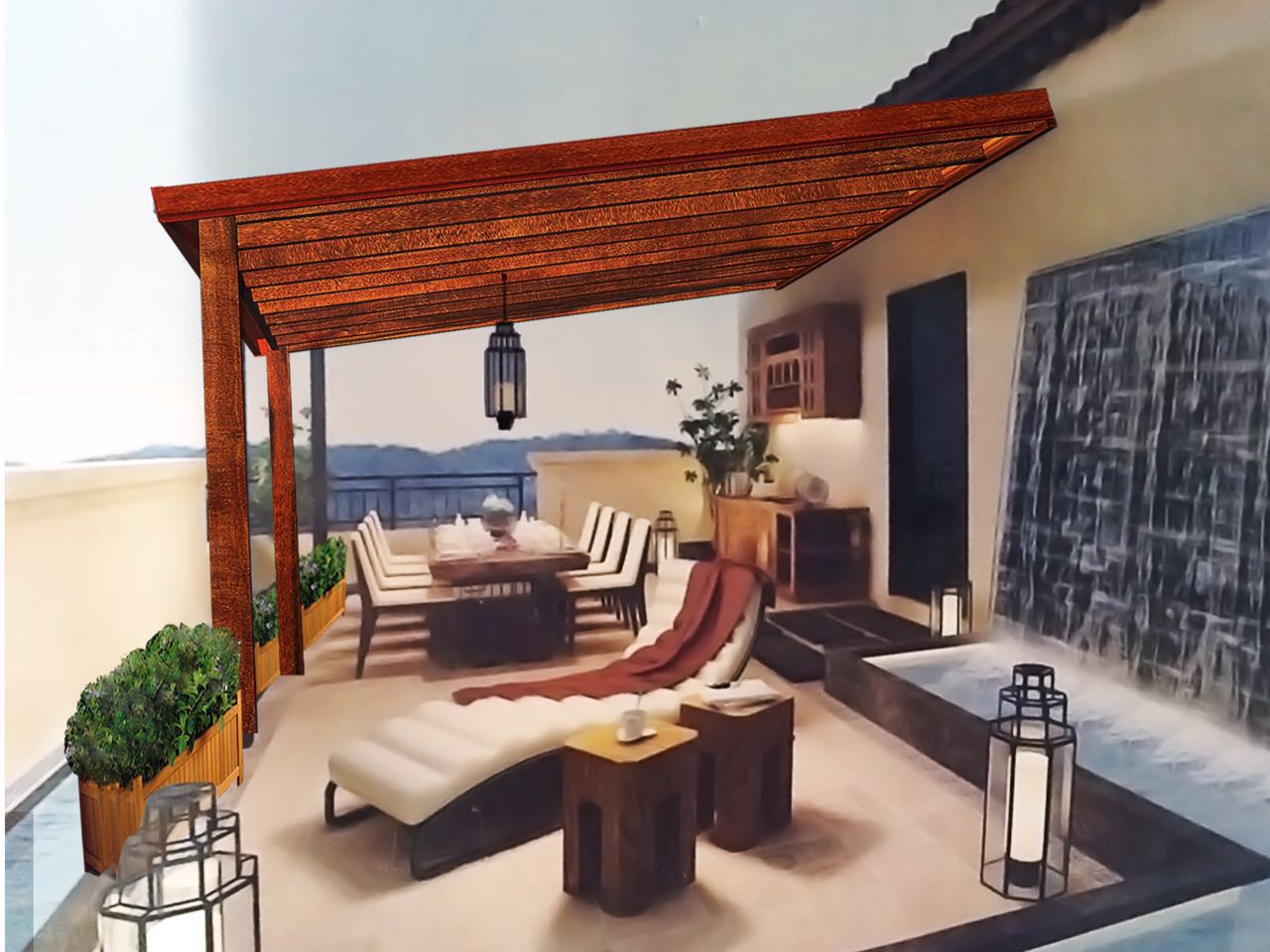 这个已做好,挂了蛛网吊灯,四周是竹帘,有厨柜,有酒架。天凉点就可品茶喝酒啃烧烤了,但拍不了全局的照