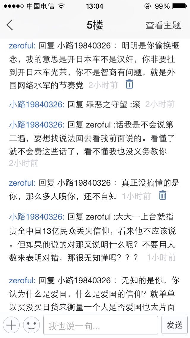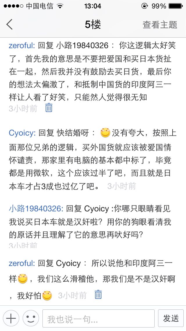 他把我的话偷换概念,说我买日本车很光荣,这智障张口说人是狗,从不正面回答人的问题,恶心的要死。
