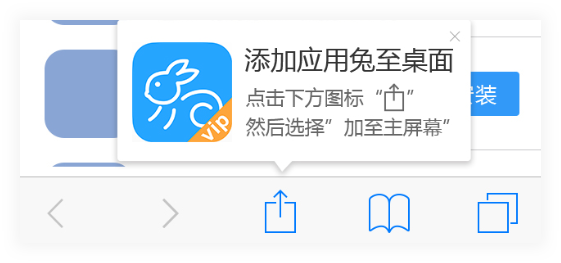 完成支付后,会自动跳转至应用兔VIP主界面,然后点击浏览器(Safari)下方的“分享”按钮,添加至主屏幕