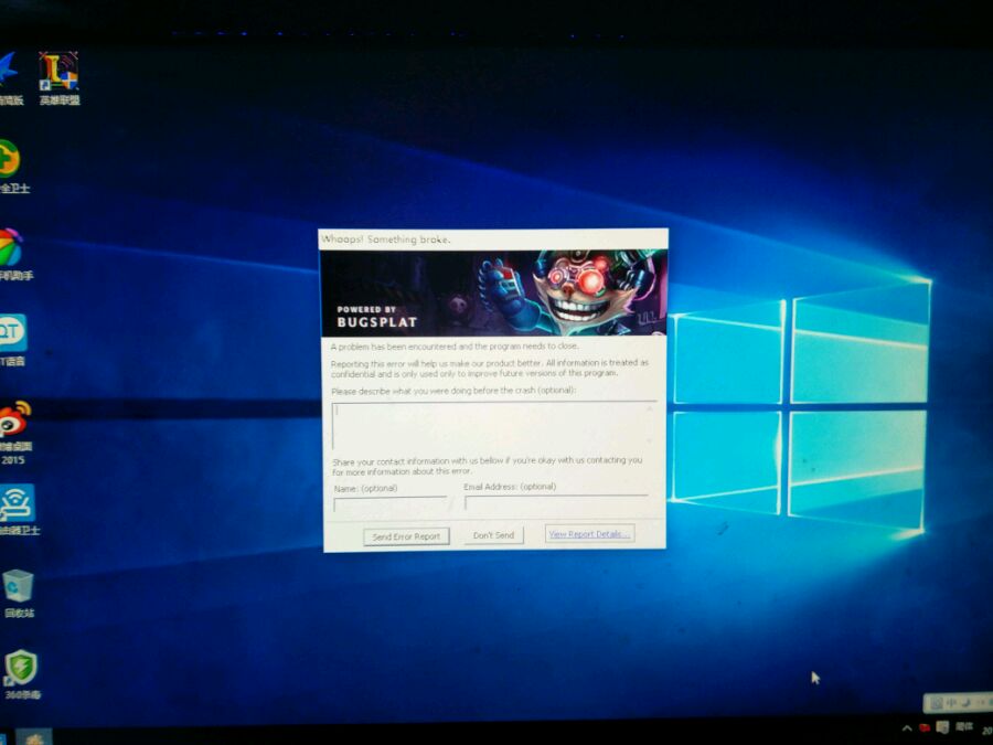 崩溃后右下角有没有一个红色的图标?点了就可以进了。以前我也遇过,因为装自定义皮肤,所以更新出毛病进不去,但每次崩溃右下角都有个红色图标,点了就回到客户端,重连就可以进了,一样WIN10
