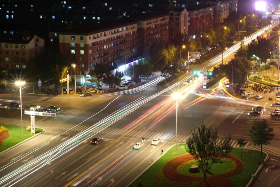 第一张角度太低了,车轨都成天轨了。第二张不知道是红绿灯时间太长还是慢门时间太短,红绿灯车流光轨比较乱,建议你不要拍十字路口。