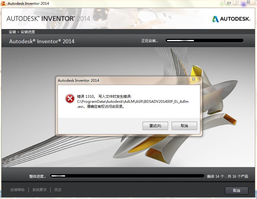 Autodesk inventor professional2014安装报错1310