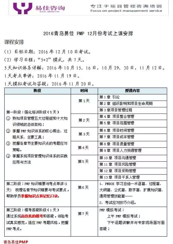 2016年青岛易佳PMP上课安排?