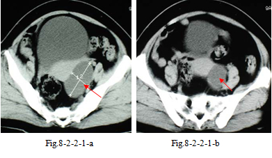 1.患者女性,52 岁。主诉:查体B 型超声发现附件囊肿。妇科内诊:子宫增大,质中,左侧可扪及150px×125px×125px大小肿物。CT盆腔平扫(Fig.8-2-2-1-a~b)示:左侧卵巢囊肿(左侧附件区100px×175px 囊性低密度,边缘光整)。手术:左侧卵巢有约150px×125px大小囊肿,表面光滑透明。术后病理:左侧卵巢多房性浆液性囊腺瘤。经验教训:CT平扫未能显示囊肿内存有间隔,而误为单纯囊肿。