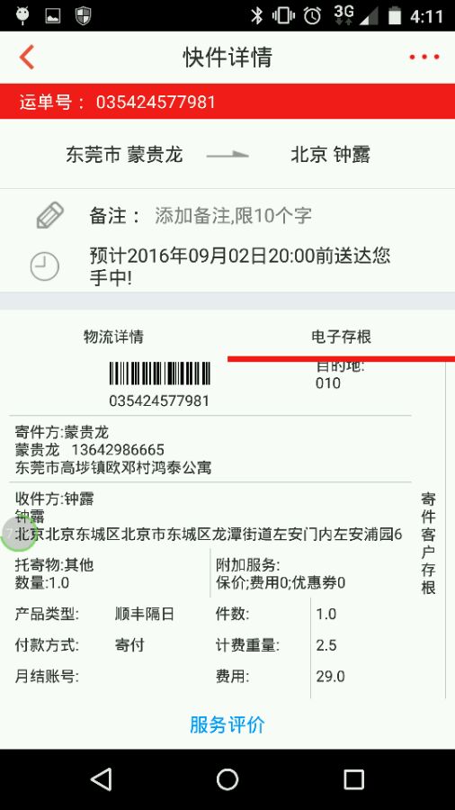 所以 收件的说29我以为是次日的 23加上续重6元 我也就给钱了 由于是电子的 当时拿到的实物单看不到是什么服务