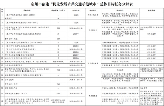 (一)总体目标。通过创建活动,建立优先发展城市公共交通长效机制,提升城市公共交通服务能力,建成“城乡一体、层次多元、便捷高效、安全舒适”的城市公共交通系统,城市公共交通环境明显改善,逐步确立公共交通在城市客运中的主导地位,实现对宿州城市发展的支撑和引领,为全省乃至全国同类型城市公交优先发展起到示范带动作用。计划到2018年,新增更新300辆新能源公交车,安装车载智能终端570套;新建5个公交停保场、面积8万平方米以上,新建公交车充电桩150个; 新建9个公交首末站和123对公交车停靠站,改造公交港湾式停靠站50个,新建智能公交电子站牌40个;新建公交专用道2条,全长37.8公里;新增公交线路12条,延伸线路3条,开通快速公交线路2条,对现有线路进行优化调整;建成公交智能调度及监控中心,建成公众出行信息服务系统;建立公共交通成本费用评价制度、政策性亏损评估和补贴制度,据实补贴,建立公交企业职工收入固定增长机制,落实补贴资金。
