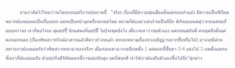 “是的。就剧情的吸引力而言,近段时间就有人开骂,说Mark (Prin Suparat)为什么要这么蠢。(有舆论批评Patricia (Tanchanok Good)的表演?)得要这么说,这要服Yard (Yardthip Rachapal),因为她四岁就进入演艺圈。而Mark也演过很多剧,这已经是他的第七部剧目。可是Pat还是新人,语言可能也讲得不是很清楚。但如果拿Pat台词的剧本来看看的话,就知道那非常难,Pat已经做得很好。在场景戏中需要有哭戏的时候,她就每场戏都真哭,没有滴眼水。如此真哭的话,真不是件容易的事情,”Tu解释道。