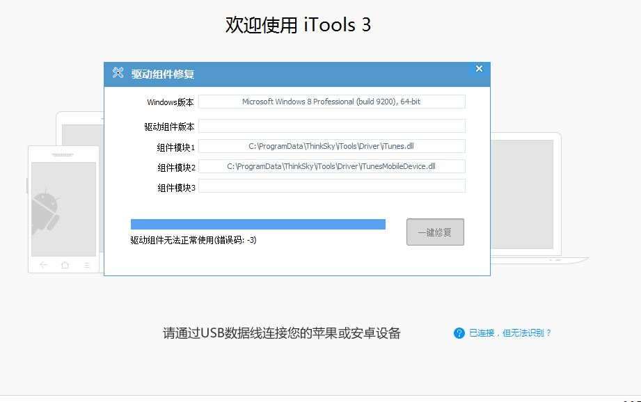 驱动不兼容,请右键点击桌面上的iTools 3(右键文件位置),在iTools 3文件夹中找到tsdiag.exe进行一键修复试试看。
