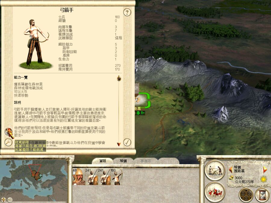 不过,弓箭手面对蛮族的裸男们和希腊民兵还是很犀利的,只要保护好用完箭之前基本能射残对面3支步兵,之后打起来就方便了。