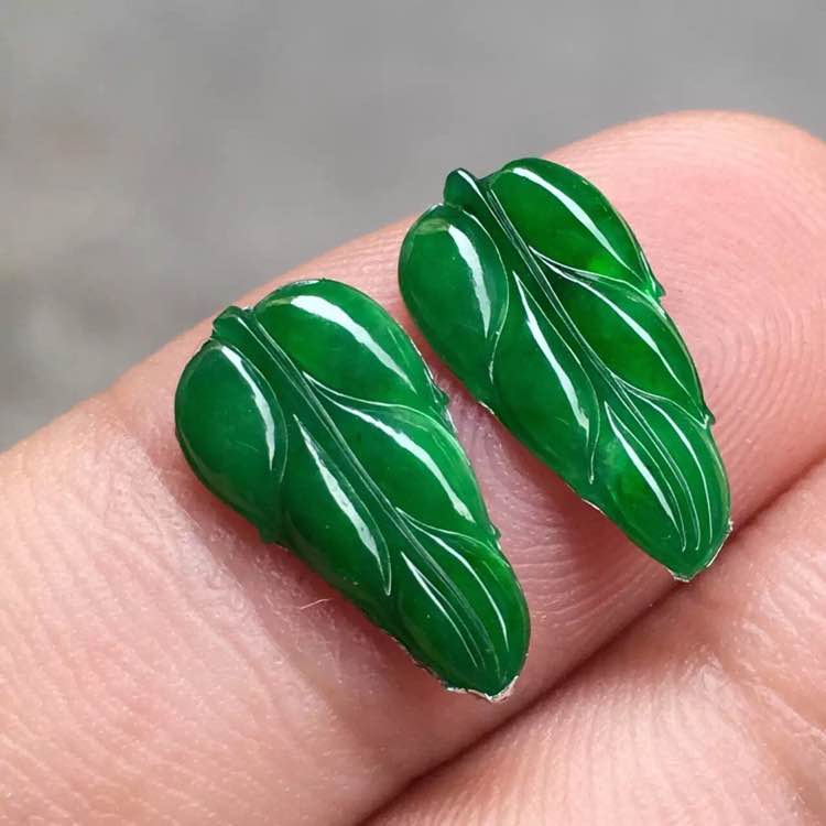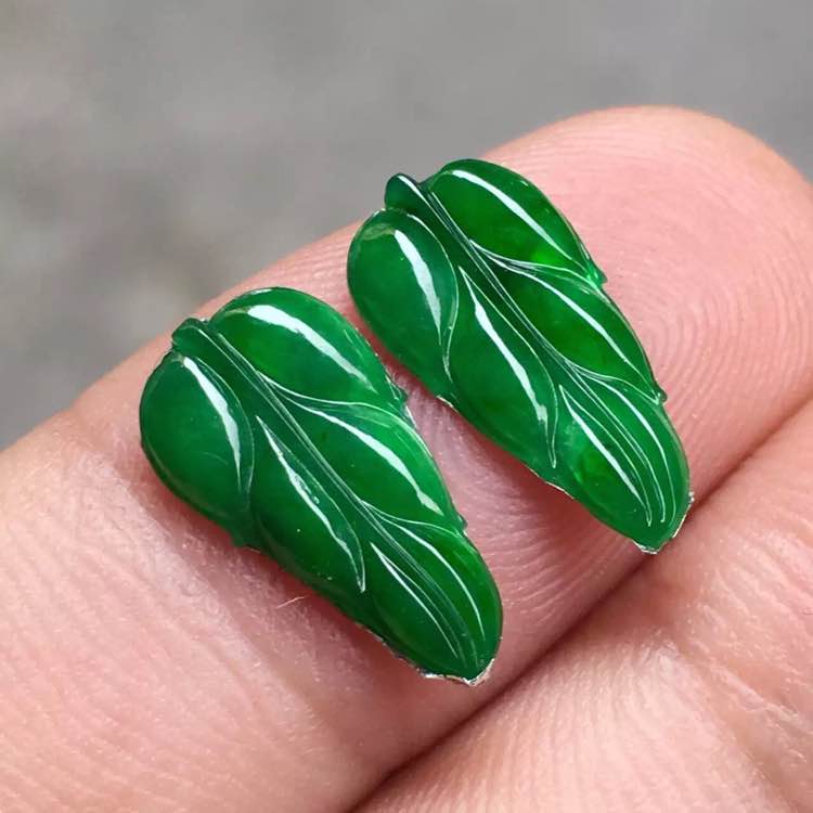 冰种满绿叶子一对 💰特惠2500 冰润通透 水润饱满 色泽鲜绿 适合镶嵌耳饰佩戴。尺寸14.8/7.6/1.8mm