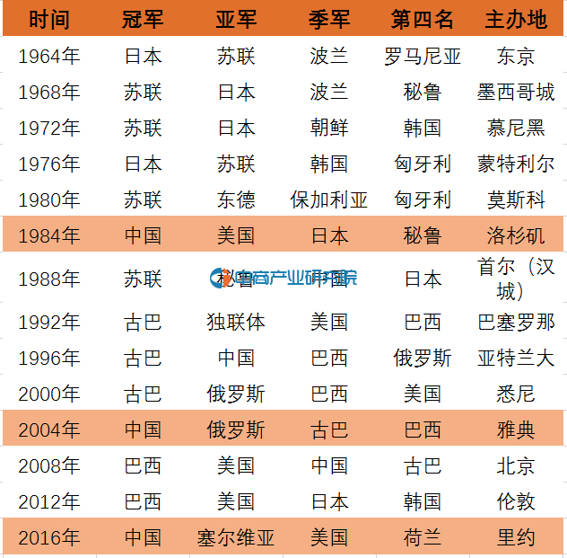自奥运有女子排球以来一共只有五个国家得过金牌