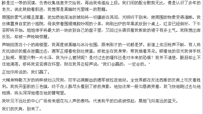 人们带着重见光明一般的笑意涌向中心广场,共同迎接即将到来的反法西斯庆典。我费劲地穿越那些欢呼雀跃的人群和飞扬的法国国旗,在喧闹中回忆起那个无比安静的早晨。