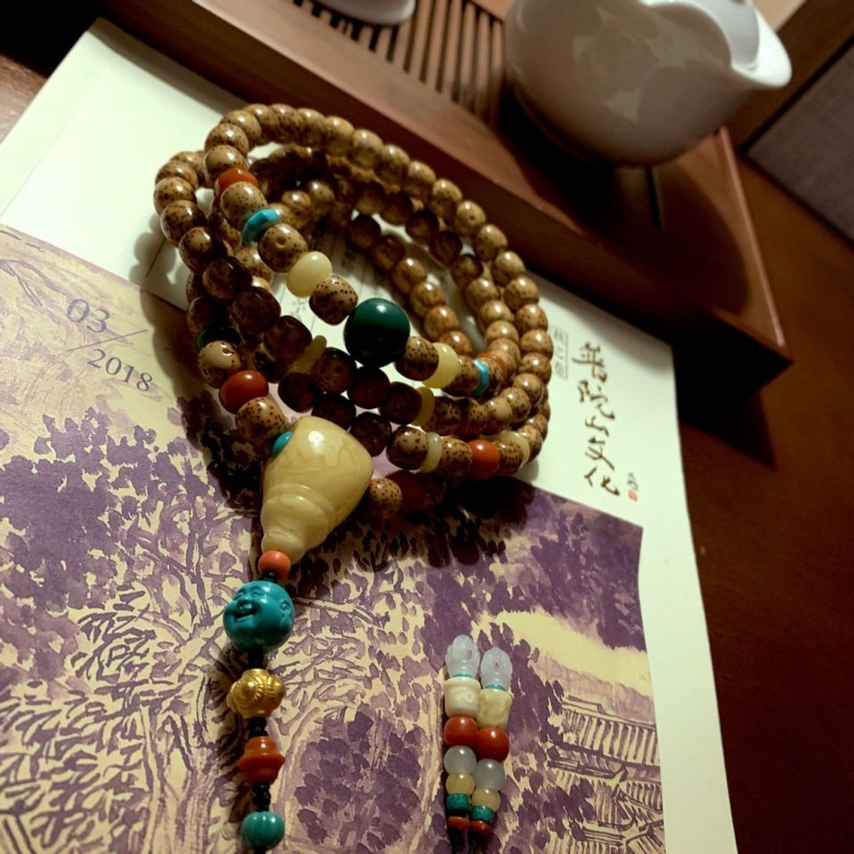 佩珠蜜蜡20mm,和1.3mm鹤顶红。佛头是象牙。最后的背云说是清朝的老佛珠翡翠。