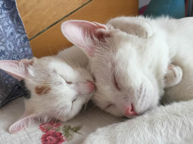 你家的好有爱啊!!!我家两只小家伙都不怎么睡一起的,只有互相舔毛的时候才…