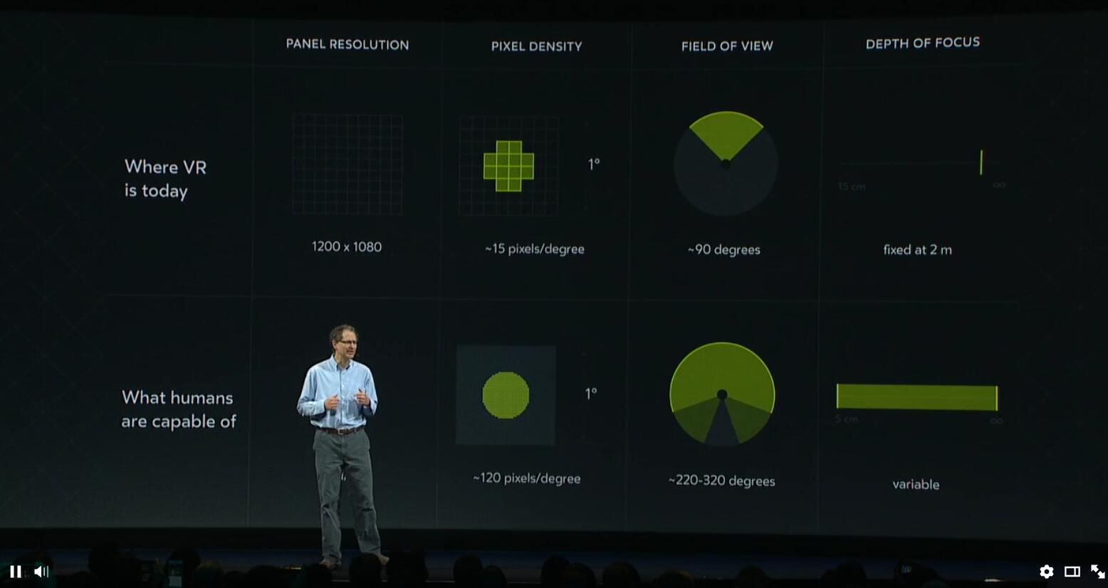 影响分辨率的一个重要因素是像素密度而非使用性。亚伯拉什解释道,人们可以选择4K屏幕来优化头显的分辨率或者FOV,但总归要牺牲其中的一项。最终,他预测,到2021年,VR头显的视觉效果将达到“足够好到通过驾照考试”的效果,尽管这需要光学研究上的突破,不过估计很快会实现。