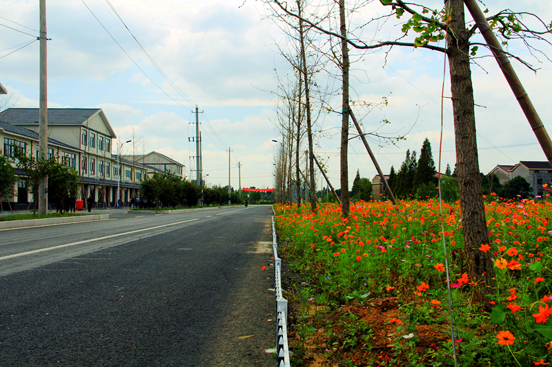 最后奉上大绝招,视觉冲撞的乐官路:一半是青瓦白墙新中式楼房与整洁的柏油马路,一半是缤纷艳丽小树花海与朴素农家。