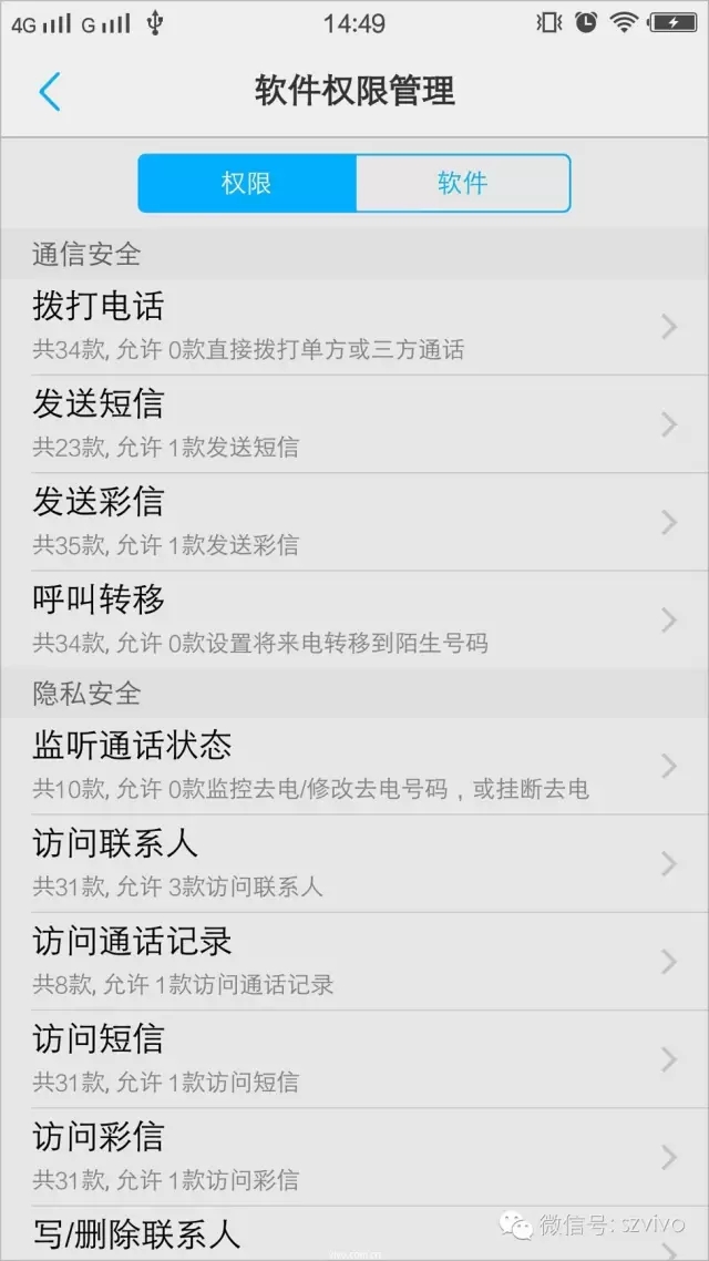 进入“软件权限管理”后,左侧的“权限”标签按权限分类列出所有的权限,右侧的“软件”标签列出所有的App,您可以按自己的喜好选择任意一种方式设置权限,最终都可以有效的控制App的权限,有效的保护您的隐私。