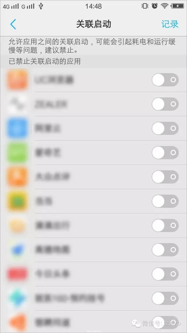 此外,列表顶部还有一个“关联启动”选项,进入后就可以在列表中看到所有会相互唤醒的App。这些App不但自己会在后台常驻运行,还会变本加厉的打开其它App在后台运行,进一步耗费手机电量,拖慢系统运行速度,取消勾选就可以禁止它们相互唤醒。点击右上角的“记录”就可以了解是哪些App有唤醒行为,您可以根据这些记录了解哪些App具备流氓性质。