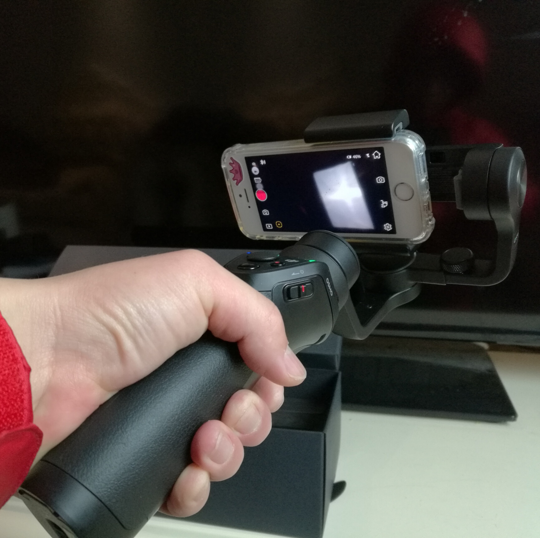 前天孩子班里课间操比赛,手持相机拍了几段移动视频,回来以后看得自己都想吐,上网一搜手机云台,立刻就被大疆的OSMO M吸引了,京东下单,今天中午就收到了,开箱视频随后上传。有个问题就是,我的爱疯SE插到底就往右偏的很厉害,调节杆调到尽头也不行,必须手机离开底座一段距离才能找平。这正常吗?