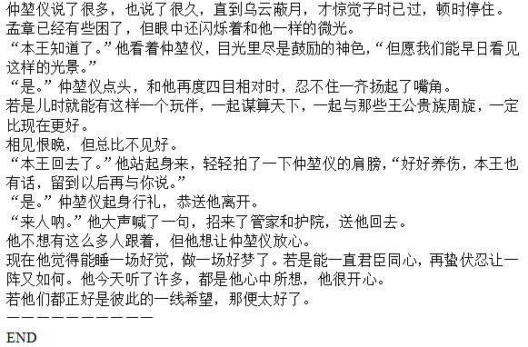 “不知王上有什么事情要吩咐?”公孙钤的话把他从思考里拉了出来。他看了公孙钤一眼,虽然着满眼的疲惫,但瞳仁里仍然闪烁着惊喜和坚定的光芒。
