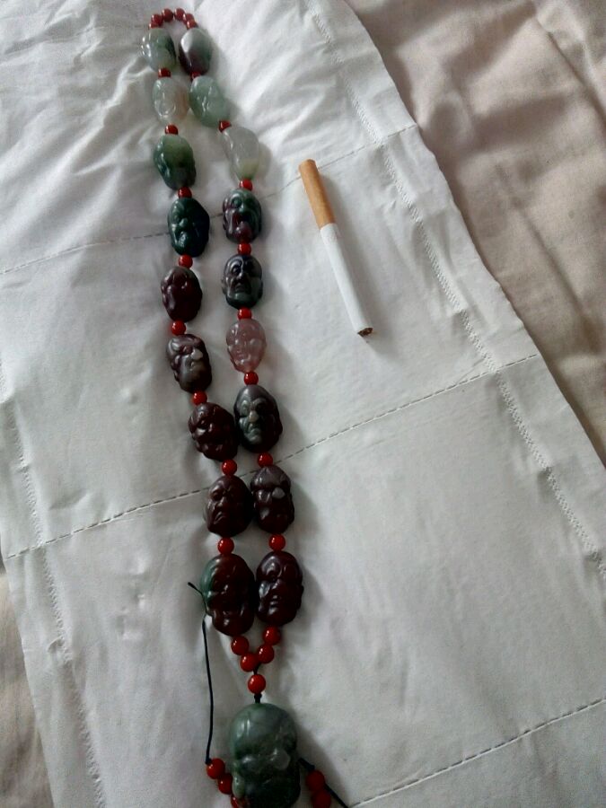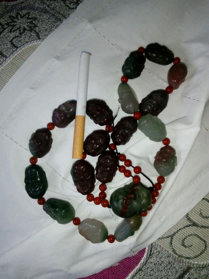 精雕紫绿玛瑙十八罗汉,佩珠南红。十八罗汉,十九颗罗汉。其中一颗摔得有些微裂,暗裂。三位数。