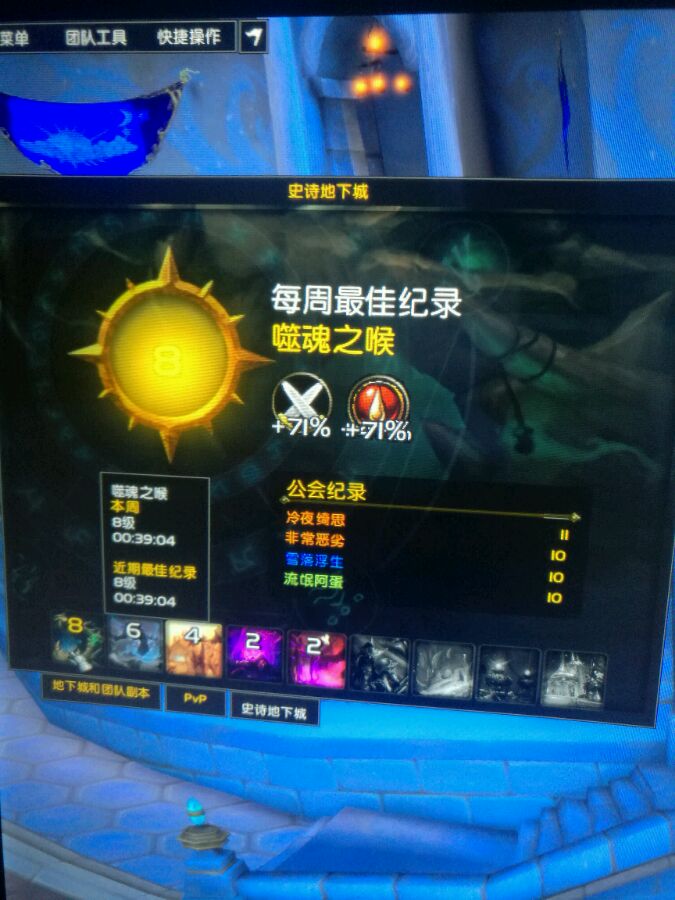 楼主小d这周才满级,和基友刷了一波5m之后装等840,目前三槽未开,在面临各种二三层大米就业被拒之后,一怒之下奋发自强,2层 升4层英灵,4层两箱升6层艾萨拉,6层两箱升8层噬魂,今晚和基友俩人,分别是864刺杀贼,858冰dk,外加俩野人sm和fs,到海拉面前还剩5分多钟。全程血量很稳,未灭团,本可以顺利通关,可惜打触手时候,毁灭触手晚拉一秒打中fs,后sm吃了圈子死了,遗憾钥匙枯萎。话说我打6层,打8层的时候队友各种质疑我能否抗的住,结果血量超稳,让他们刮目相看。