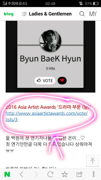 点开投票链接,点左上角的三横标志,再点KO,把语言切换成中文(切换成中文后页面顶端会有#每天可以投一次每个ID。#字样),然后点KO边上的LOGIN登录,会出现绿色(用naver登录)和蓝色(用facebook登录)按钮,点绿色按钮,就自动登录了。